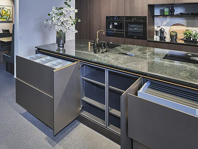 SieMatic SLX-K Eiche Oolong matt und SLX-MZ Metallic Bronce gebürstet Koje 32 KL: Luxuriöse, grifflose Inselküche mit Granit Arbeitsplatte