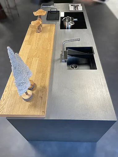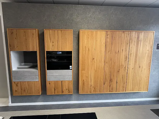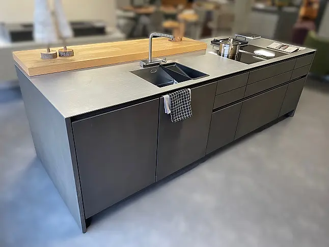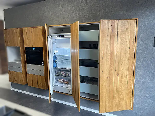 Leicht Hochschrankwand mit Koch- und Spülinsel Concrete und Eiche massiv Vollwertige Ausstellungsküche mit massiver Edelstahl Arbeitsplatte