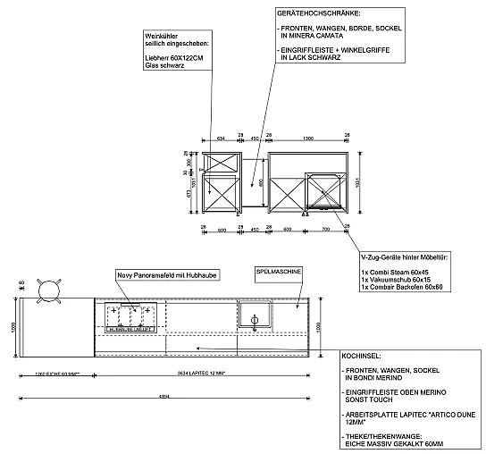 Länge 2,40 / 2,80 m - das Element mit Weinkühler und Apothekerauszugschrank kann statt seitlich angesetzt, auch um 90 Grad nach vorn gedreht werden, damit eine längere Hochschrankzeile von 2,80 m entsteht. Die Tiefe der Seitenwange kann gekürzt werden auf 70 cm wegen der Einschubtür.