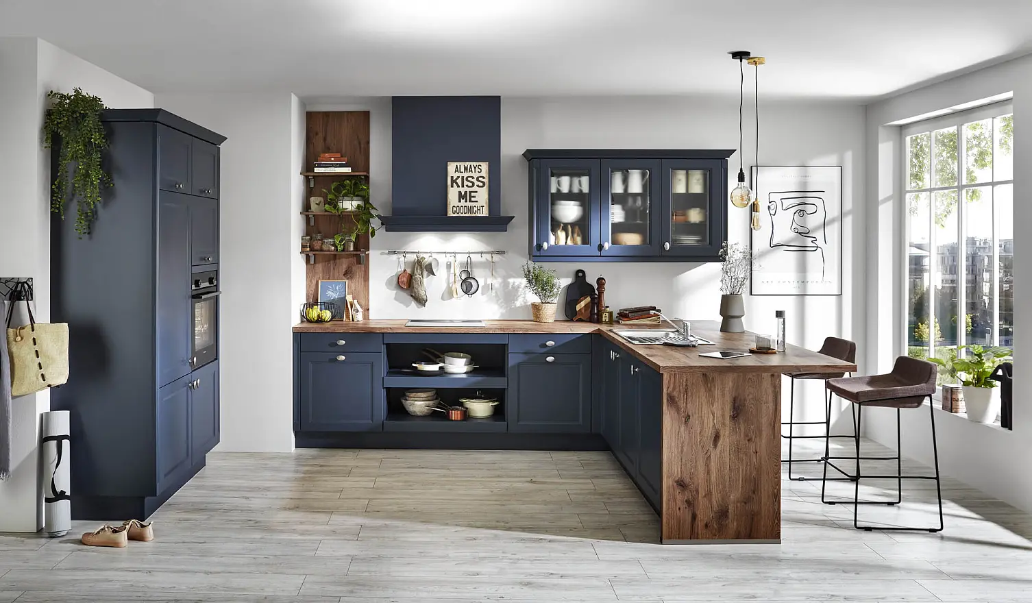 Dunkelblaue Landhausküche mit Arbeitsplatte aus Holz